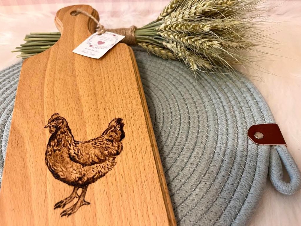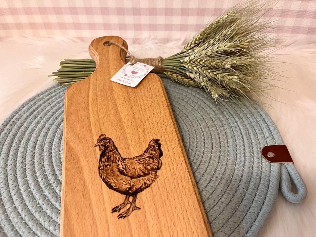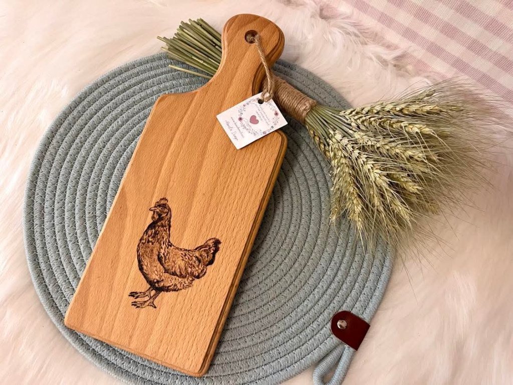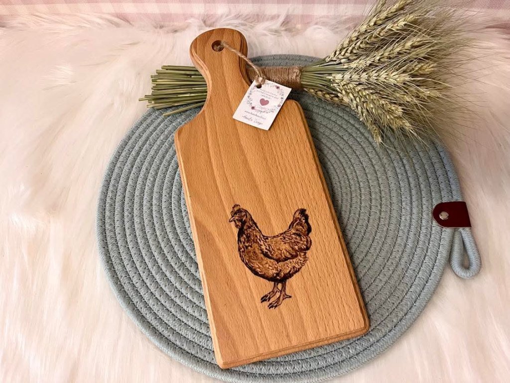 Kuchyňské prkýnko z farmářské kolekce, s ručně vypáleným motivem slepice. Do prkýnka jsem již vetřela jedlý olej, pro jeho ošetření, doporučuji ale vetřít olej opakovaně. Prkýnko má očko s jutovým poutkem, dá se zavěsit v kuchyni. Kromě toho že je velmi dekorativní, tak je i funkční pro krájení a třeba i servírování. Je vyrobeno z bukového dřeva, tudíž je tvrdší a pevnější. Každý kus je ručně tvořený originál, tedy celá kolekce je po jednom kuse ;)
