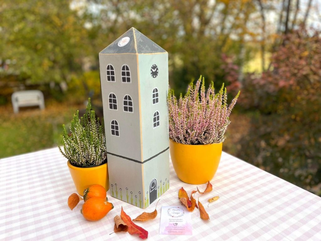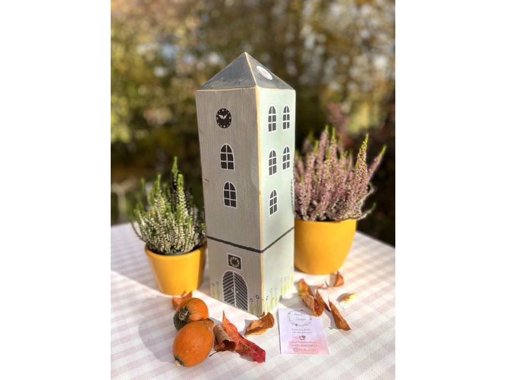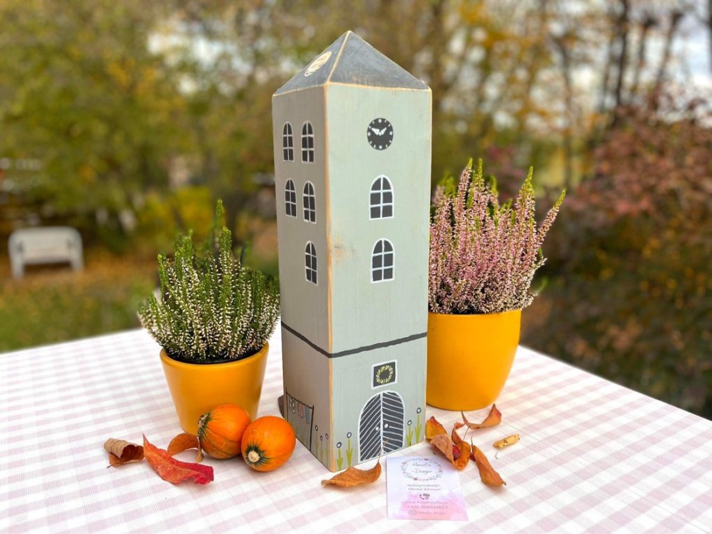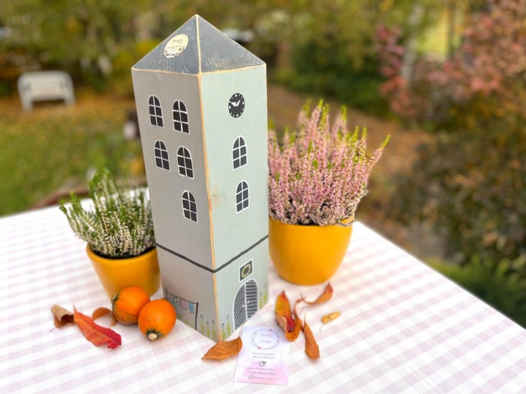 Dům ze dřeva "majákovitého typu" , jež jsem nazvala Alfa produktem, z plného smrkového hranolu, určená jako doplněk - dekorace ... domů nebo ven na zahradu. Věž je ošetřená lakem tak, aby vydržela celoročně venku. Dekorování - malování, nátěr je prováděn ručně, bez šablony, a každý kus je jen jediný. Dekorování je kolem dokola celého produktu. Má patinované hrany a rustikální ráz.