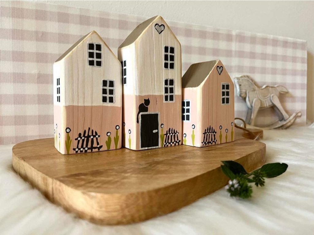 Domečky určené k dekoraci uvnitř i venku. Jsou ze dřeva, malované i ošetřené tak, aby vydržely celoročně venku a zvládly odolávat celoročnímu počasí. Domečky mají rustikální design, jsou ručně dekorované ze tří stran, mají patinované hrany a působí tak velmi pěkně a romanticky, jsou vhodné i jako milý dárek. Dají se pěkně kombinovat s většími domečky dekorativnost se znásobí.